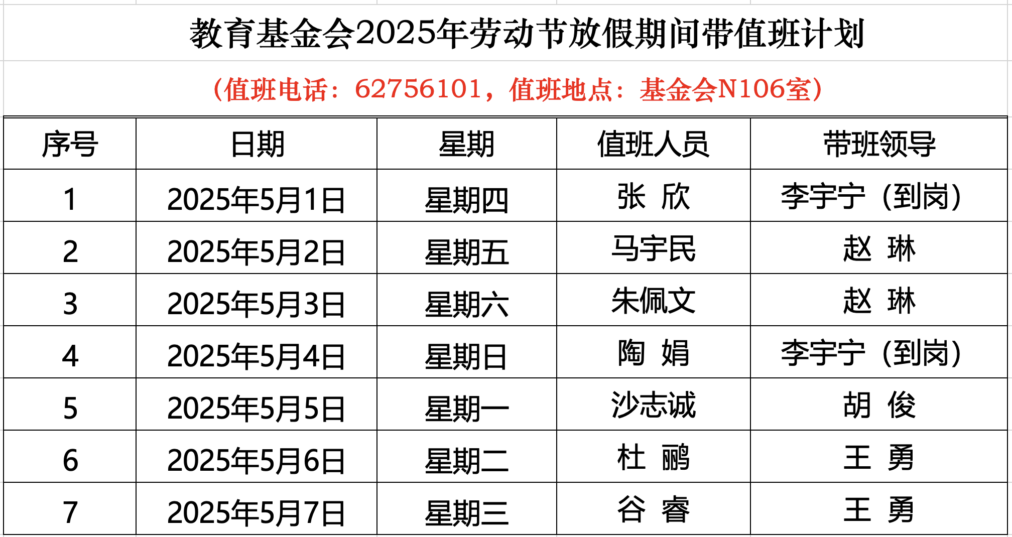 北京大學(xué)教育基金會2025年勞動節(jié)放假期間帶值班計劃公布如下: